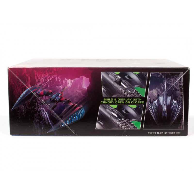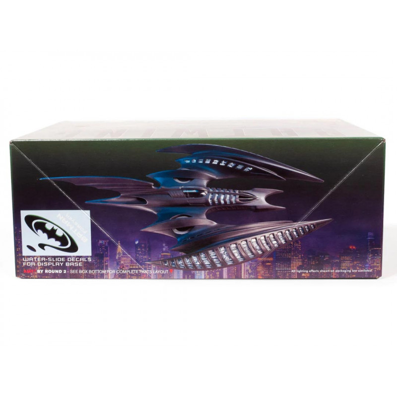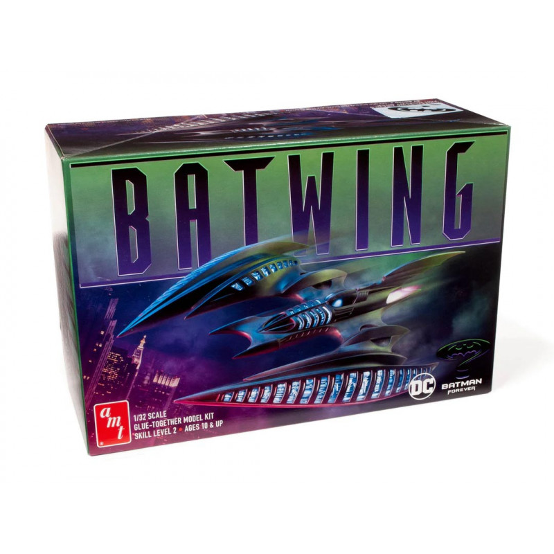 Der AMT Batman Forever Batwing Bausatz im Maßstab 1:32 enthält eine abnehmbare Kabinenhaube, einen großen Heckspoiler, ausgeschnittene Verkleidungen, verchromte Motordetails, getönte Scheiben, ein detailliertes Cockpit und einen Präsentationsständer. Der Bausatz enthält außerdem Batman Forever-Abziehbilder und eine ansprechende Verpackung.