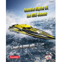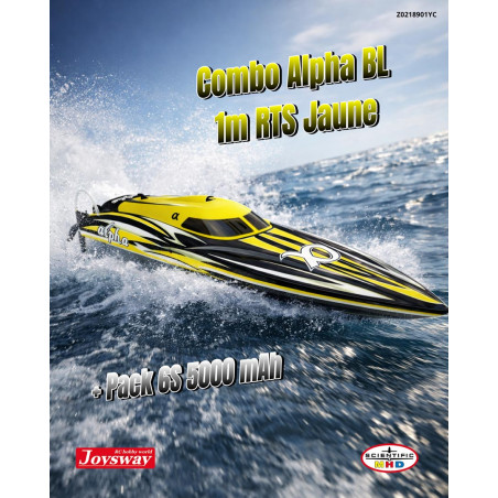 Equipment on the ALPHA remote-controlled boat in 6S: You will need to mount the engraved 6S propeller on the propeller shaft.Be sure to choose the appropriate propeller based on the batteries selected to avoid severe damage to the motor and ESC.The battery charger is not included and must be purchased separately.Hull length: 950 mm, overall boat length 1060 mm.Weight without battery 2.6 kg.Delivered in yellow and black under this reference.