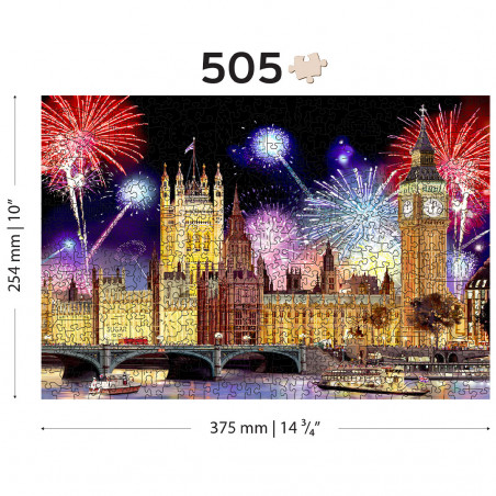 Beim Zusammensetzen dieses Puzzles für Kinder und Erwachsene entdecken Sie die Schönheit Londons bei Nacht: den majestätischen Westminster-Palast, den zeitlosen Big Ben, den roten Doppeldeckerbus auf der hell erleuchteten Brücke, farbenfrohe Feuerwerke am Himmel und Boote, die sanft über die Themse gleiten. Jedes Detail spiegelt den Zauber dieser Stadt wider.