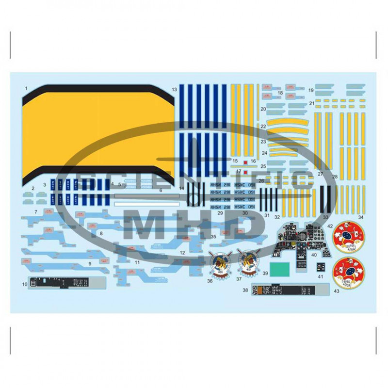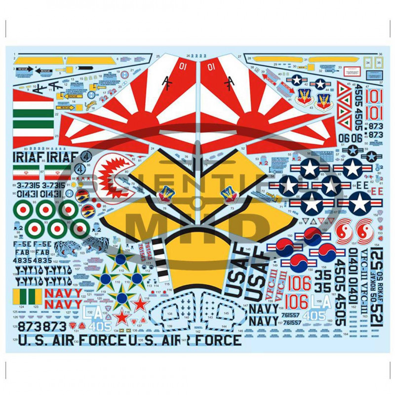 Die im Modellbausatz enthaltenen Dekorationen sind jene der USAF "Aggressors", US Navy, Mexiko, Südkorea, Iran, Singapur und Brasilien.