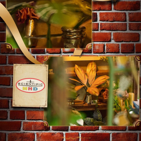 Ein Dekor, das einem Blumenladen nachempfunden ist, gefüllt mit zahlreichen Gegenständen und Lichteffekten.
