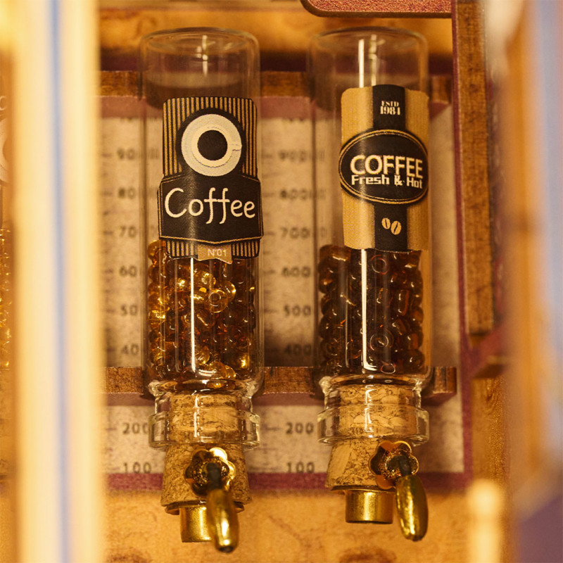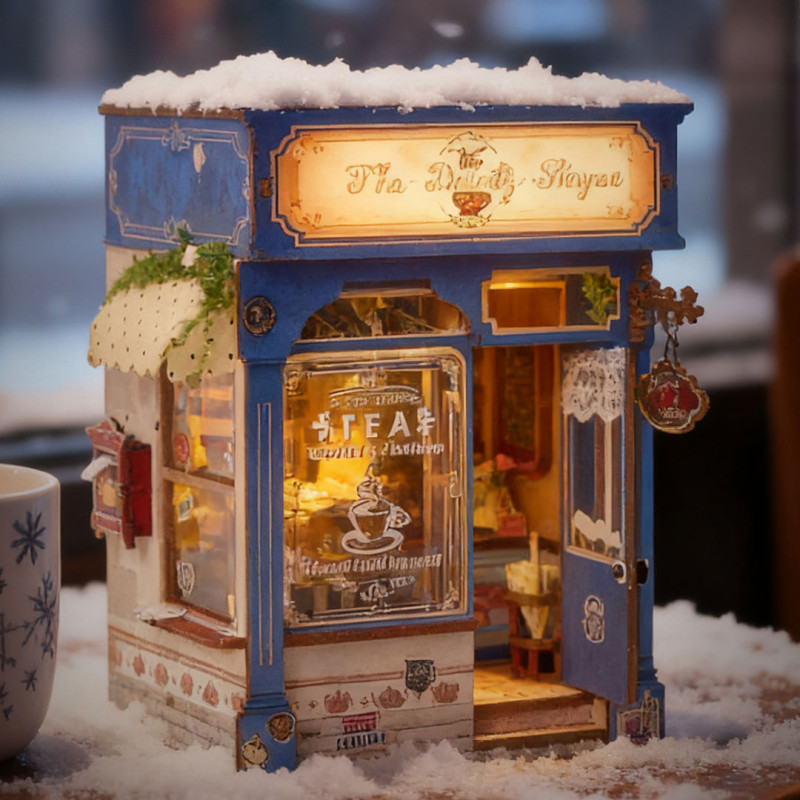 Ein Dekor, das einer Teestube nachempfunden ist, mit zahlreichen Gegenständen und Lichteffekten.
