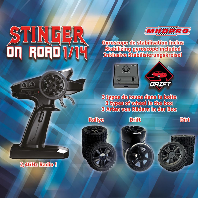 Der STINGER ON ROAD 1/14 wird vollständig montiert und fahrbereit geliefert und hebt sich deutlich von seinen Konkurrenten auf dem Markt für elektrische Driftfahrzeuge ab.