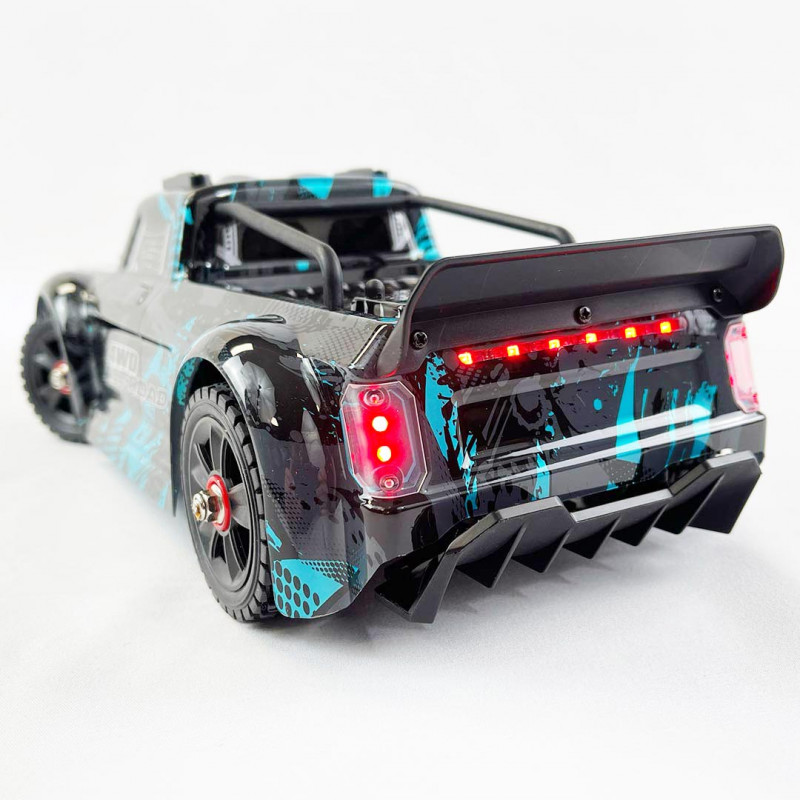 Das Auto wird mit einem Original-2S-Akku (7,4 Volt) geliefert, kann aber auch mit einem 3S-Akku (11,1 Volt) für mehr Leistung ausgestattet werden, was das Fahren auf sehr rutschigen Oberflächen anspruchsvoller macht. Um die Kontrolle über das Auto zu erleichtern, gibt es eine zusätzliche Option, um die Motorleistung auf 70% zu begrenzen, die auf dem Sender der Fernsteuerung verfügbar ist.