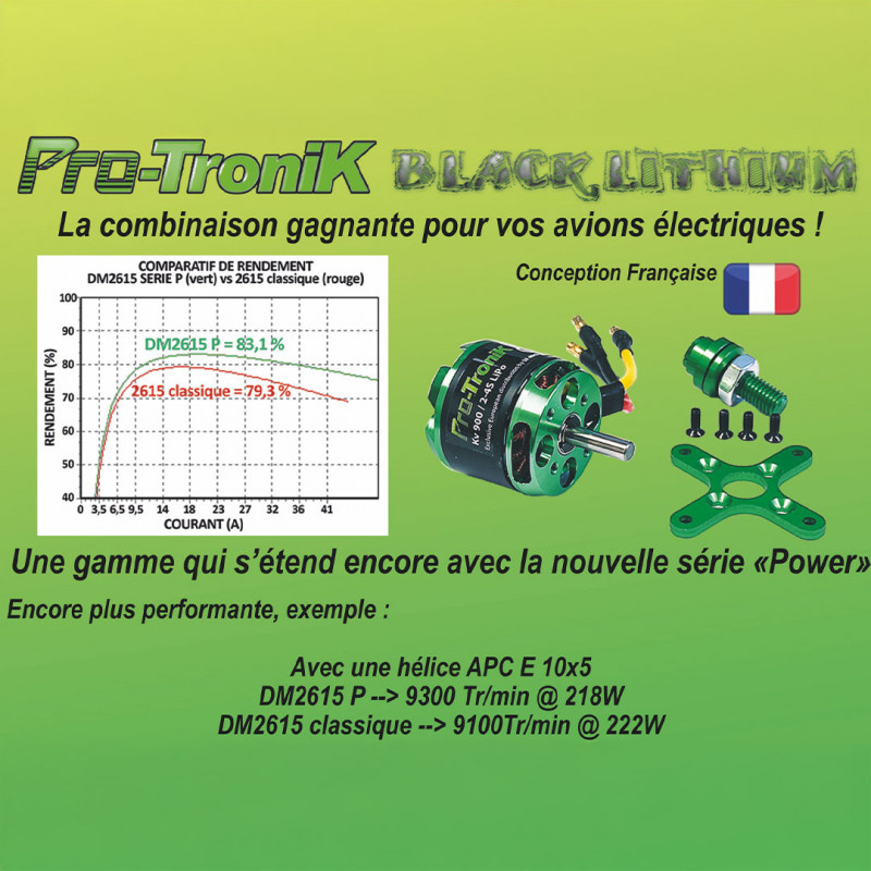 Spezialist seit 1955Bürstenloser Motor 2615P / Kv 1000 neue POWER ProTronik SerieBürstenloser Hochleistungsmotor, französisches Design.Für Flugzeuge bis 2,8 kg / Segelflugzeuge bis 3,3 kgKv 1000 / 104,2 g / 330 W
