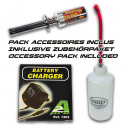 Sie werden mit einer Pipette zum Befüllen des Kraftstofftanks, einer Zündkerzensteckdose zum Starten des Motors und einem Netzladegerät geliefert.
