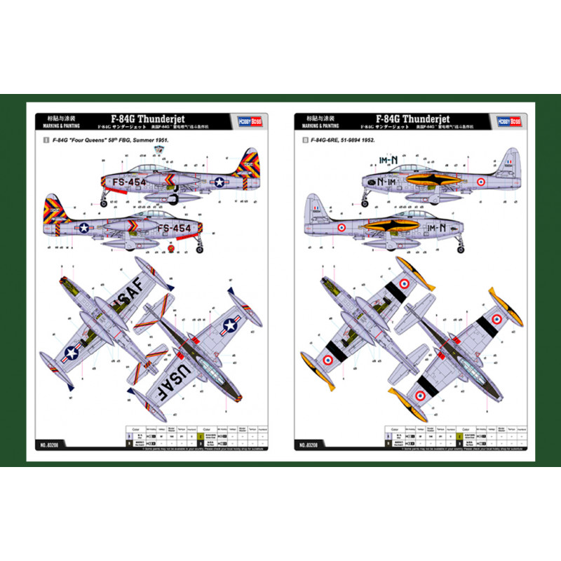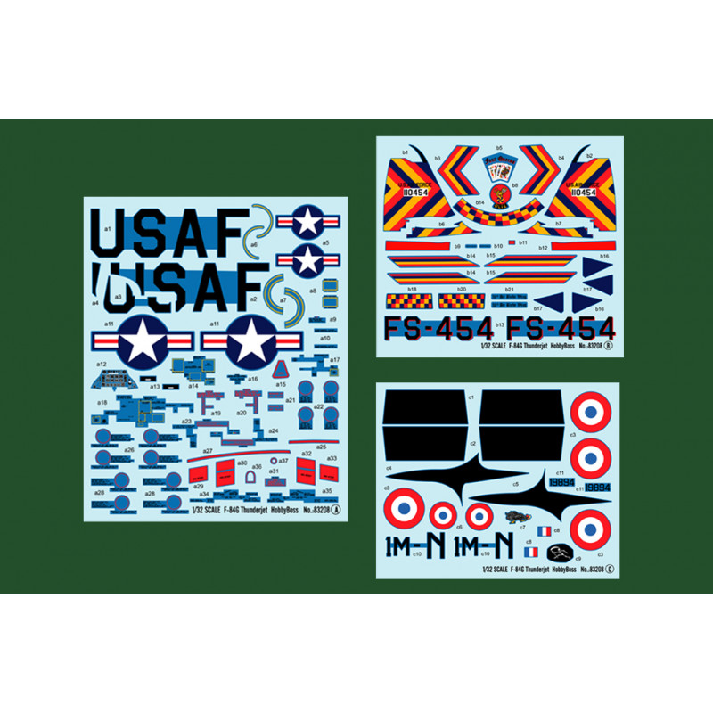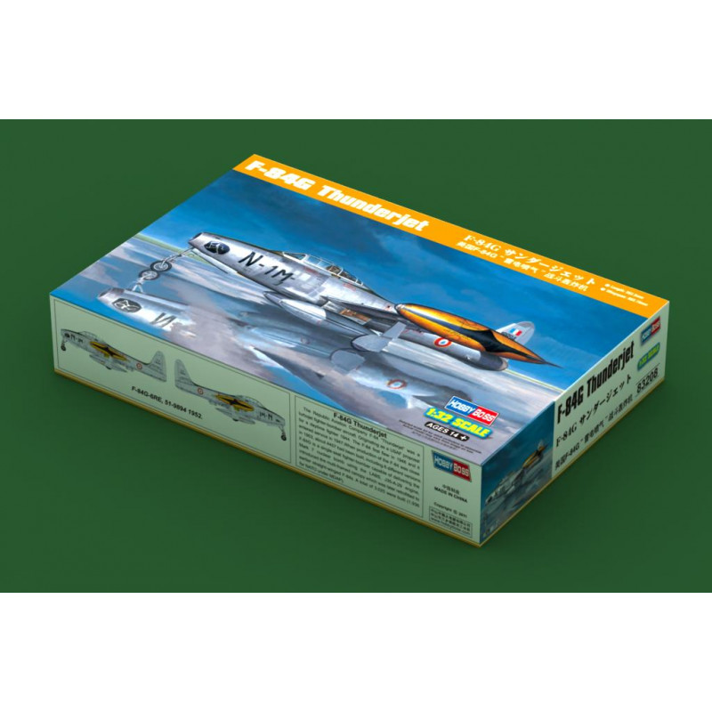 C'est une grande nouveauté pour cette fin d'année que HOBBY BOSS nous propose avec cette version inédite en maquette avec ce Thunderjet 1/32 aux couleurs Françaises. 290 pièces plus les roues pour cette magnifique maquette riche de détails. Fuselage en 2 parties droite et gauche moulé avec d'authentiques détails à l'intérieur, cockpit finement reproduit. Nouvelles ailes complètes avec possibilité de positionner les volets différemment, train atterrissage au choix en plastique ou métal. Nombreux armements inclus. Décoration Française et US Air Force. Dimensions de la maquette 362,5 mm, Envergure 393,75 mm.