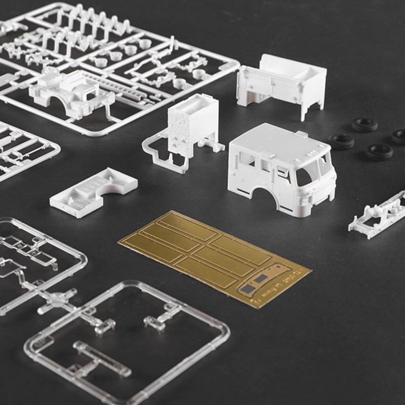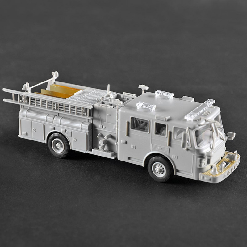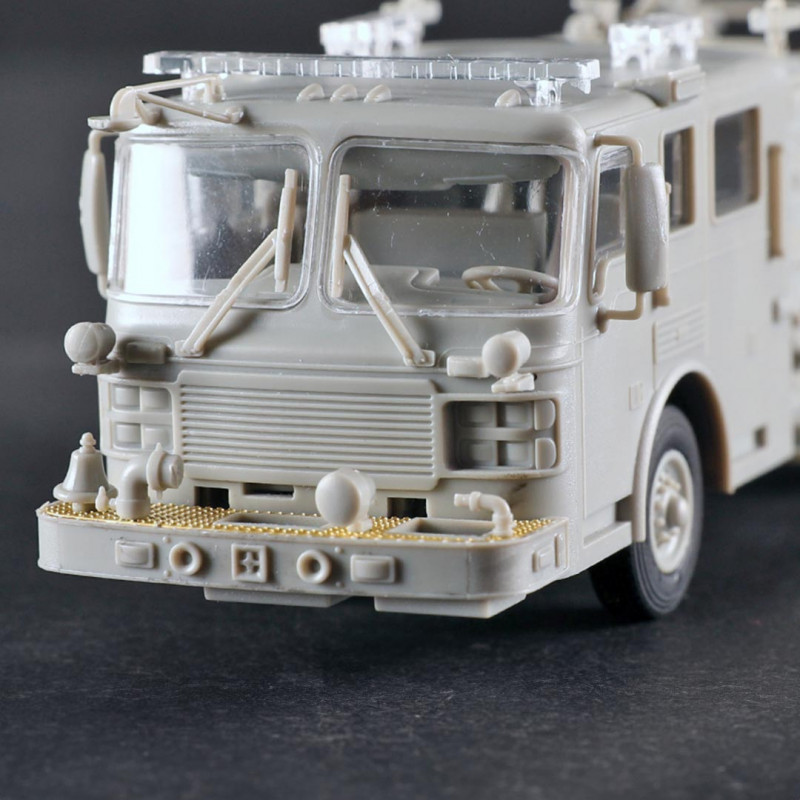 Plastikmodell eines amerikanischen Feuerwehrautos, das durch Kleben zusammengesetzt und bemalt werden kann.