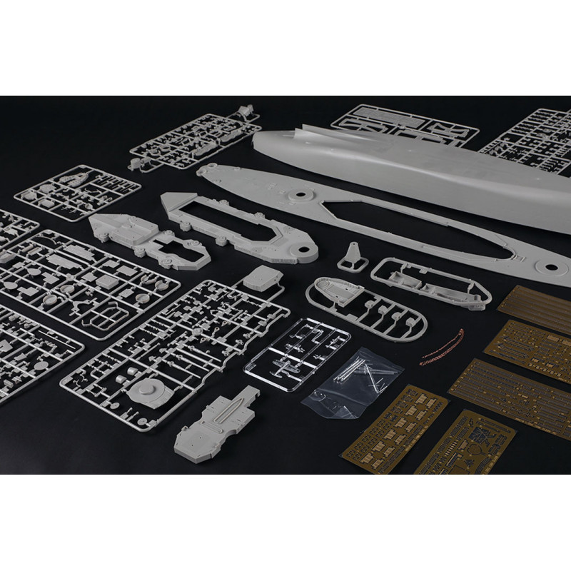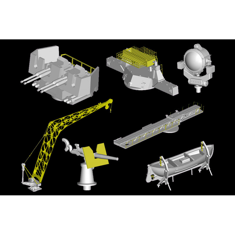 • Sehr viele fotogeätzte Teile für maximale Detailgenauigkeit (Kran, Geländer, Antennen, Radar, Leitern usw.).