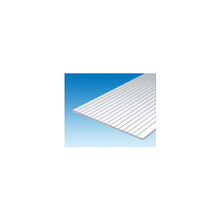 Plaque de polystyrène blanc profilée. Dimensions de la plaque : 152 x 304mm. Epaisseur : 1,01mm. Ecartement entre les rainures : 2,54mm.