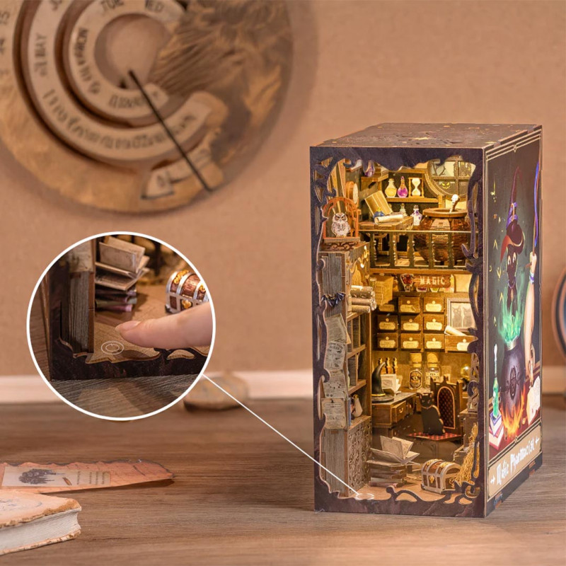 Magic Pharmacist – Buchstütze (Book Nook), hauptsächlich aus Holz, zum Selbstzusammenbauen (Do It Yourself) durch Stecksystem und Kleben.