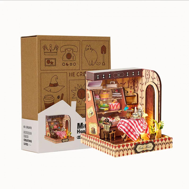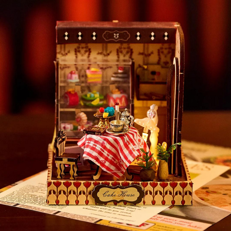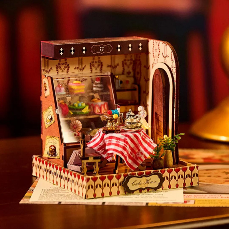YUMON SWEETS – Buchstütze (Mini Book Nook), hauptsächlich aus Holz, zum Selbstzusammenbauen (Do It Yourself) durch Stecksystem und Kleben.