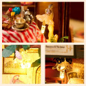 Ein Dekor, das einem kleinen Teesalon nachempfunden ist, mit zahlreichen Gegenständen und Lichteffekten.