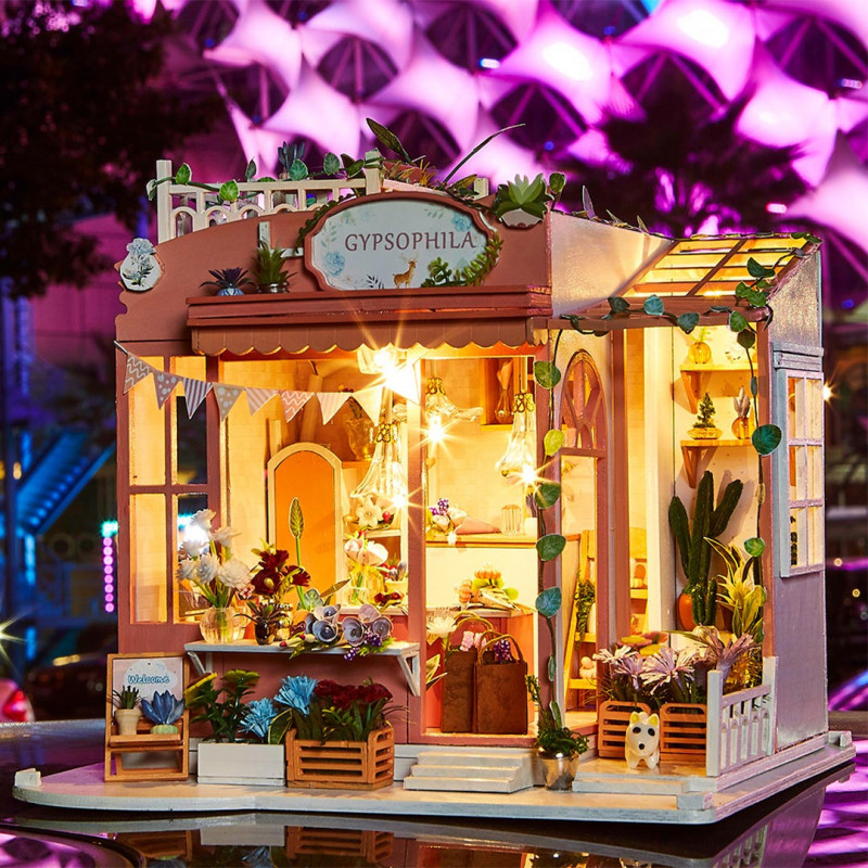 Blumenladen Gypsophila, Miniaturhaus oder Puppenhaus, hauptsächlich aus Holz, Papier und Stoff zum Selberbasteln (Do It Yourself).
