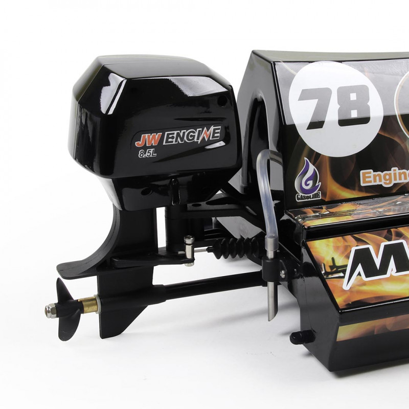 Dieses Speedboot hat einen Kunststoffrumpf mit Wassertransferdruck-Stickern (Water Transfer Printing Stickers), die mit einem Decklack geschützt sind.