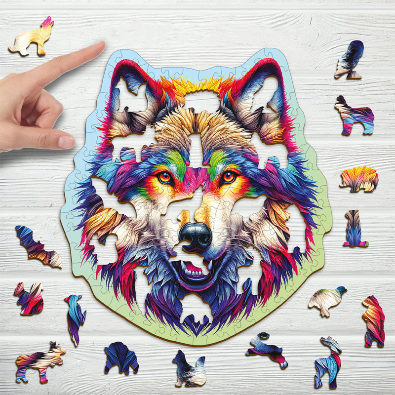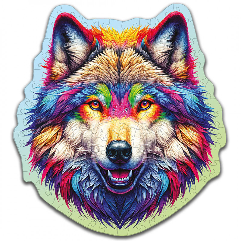 Entdecken Sie das Holzpuzzle “Traumhafte Regenbogenwolf” mit 150 Teilen – eine atemberaubende und fantasievolle Kreation, die eine Wolf in leuchtenden Regenbogenfarben zum Leben erweckt.