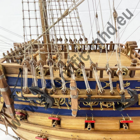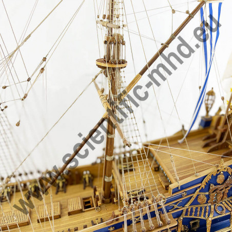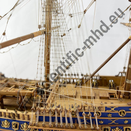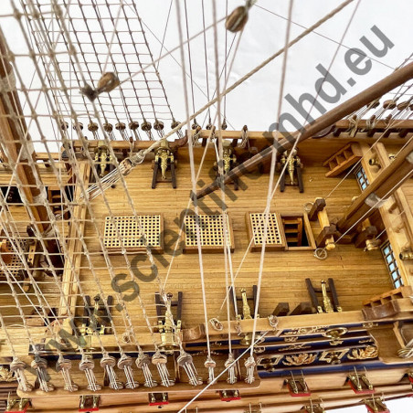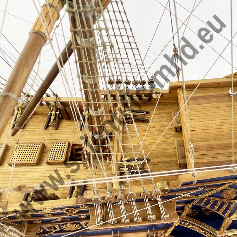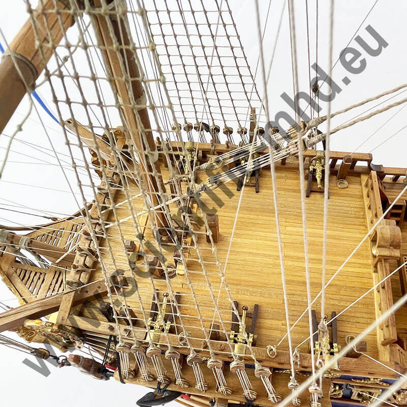Die Flaggen sind auf echter Seide gedruckt, die Anker und Metallzubehör sind von beeindruckender Wirkung. Die zahlreichen und außergewöhnlichen Detailzeichnungen erleichtern den Bau des Modells erheblich.