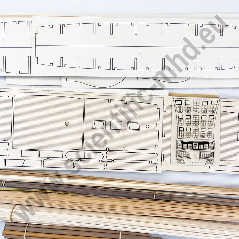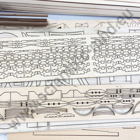 Der aus Holz gebaute Rumpf ist mit einer doppelten Beplankung aus Nussbaumleisten versehen, alle Holzteile sind laser-geschnitten für eine perfekte und einfache Passform der Teile. Die Farben des Rumpfes betonen das dekorative Aussehen dieses Modells noch mehr.