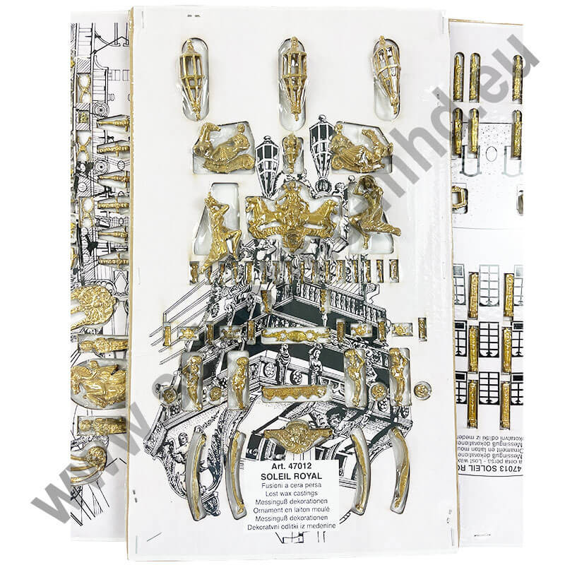 Die 108 Artillerieteile und Beschläge sind aus gegossenem Messing mit einer polierten und glatten Oberfläche. Alle übrigen Verzierungen sind ebenfalls aus gegossenem Messing. Alle benötigten Beschlagteile sind entweder aus Nussbaum oder aus Messing und Metall.