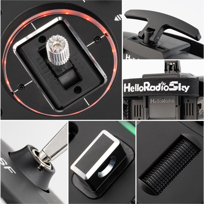 Die Sticks sind mit programmierbaren mehrfarbigen LEDs beleuchtet, die es dem Piloten z.B. ermöglichen, den Zustand des Modells zu visualisieren: blinkendes Rot, wenn der Motor ausgeschaltet ist, Orange, wenn eingeschaltet, Grün, wenn die Gashebel aktiv sind.