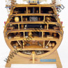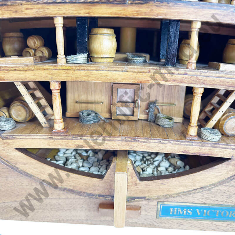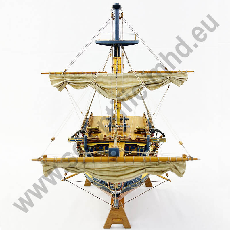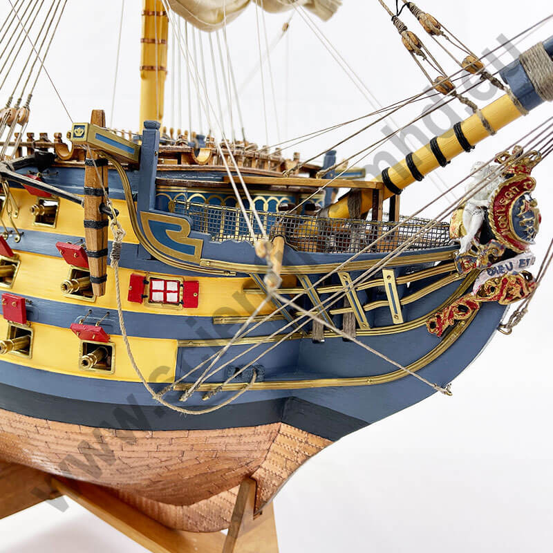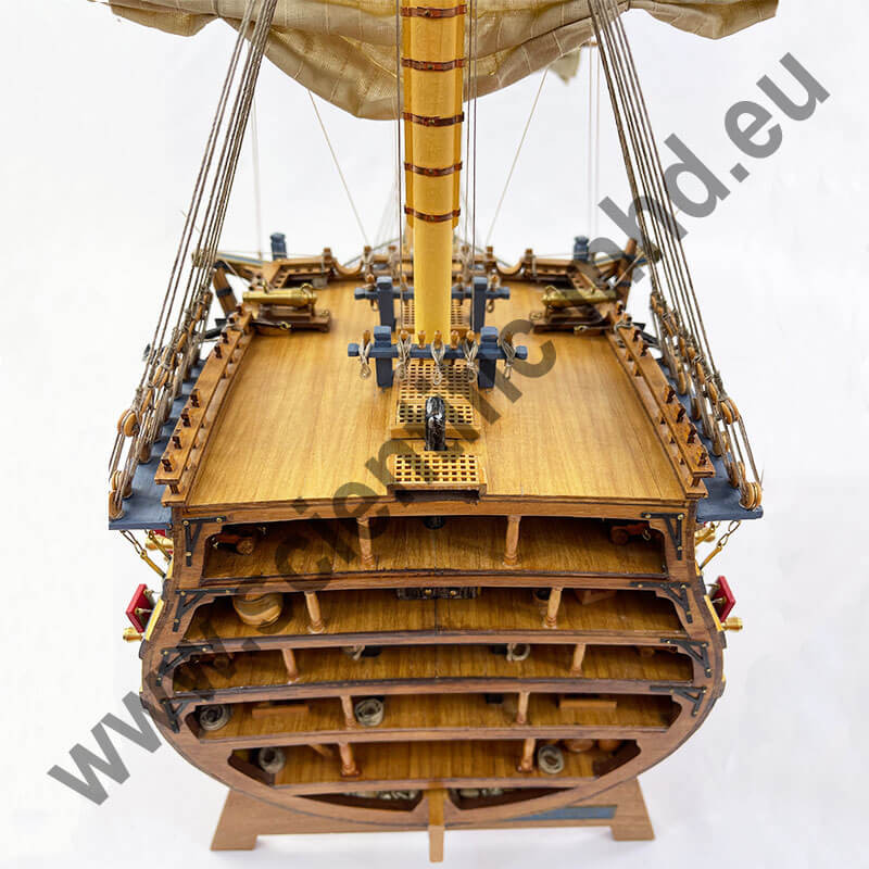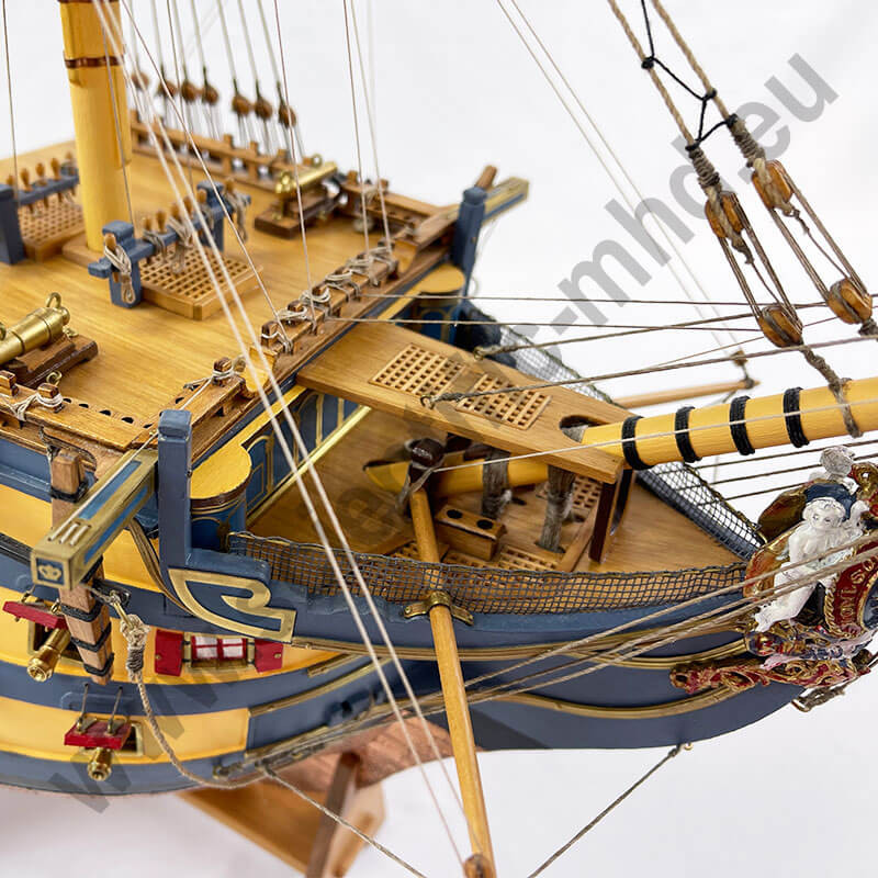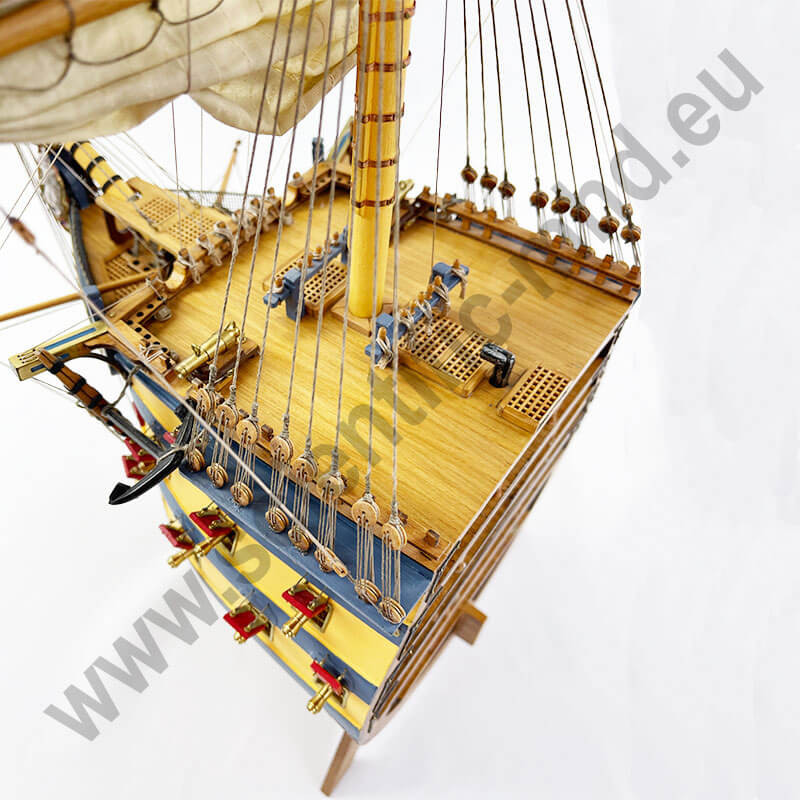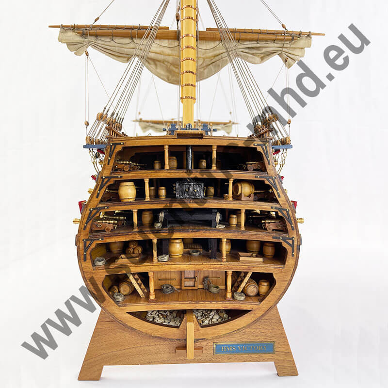 Skulpturen und Symbolik: Der Bug der Victory war reich mit Skulpturen geschmückt, die allegorische und mythologische Figuren darstellten. Diese Skulpturen drückten patriotische, religiöse und maritime Werte der Epoche aus. Das Modell ermöglicht es uns, diese künstlerischen und symbolischen Details zu bewundern, die dem Schiff eine tiefere Bedeutung verliehen haben.