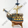 Die Schachtel enthält doppelte Nussholzbeplankung, schwarzbronzierte Geschützpforten, Geschütze verschiedener Kaliber, Messing- und Nussholz-Zubehör, fein nachgebildeten Bugspriet, detaillierte Bauanleitungen mit Montageanweisungen.