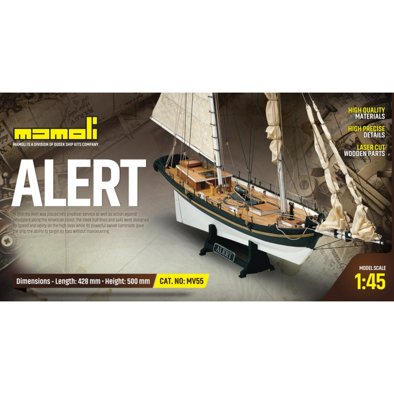 L'Alert était un navire léger et très rapide, employé contre la contrebande le long des cotes américaines. La ligne de la coque et la voilure semblent aujourd'hui incroyables pour un navire de 1818, mais ce type de navire était au contraire très courant pour les navires américains de l'époque. L'armement était composé d'une seule carronade pivotante.