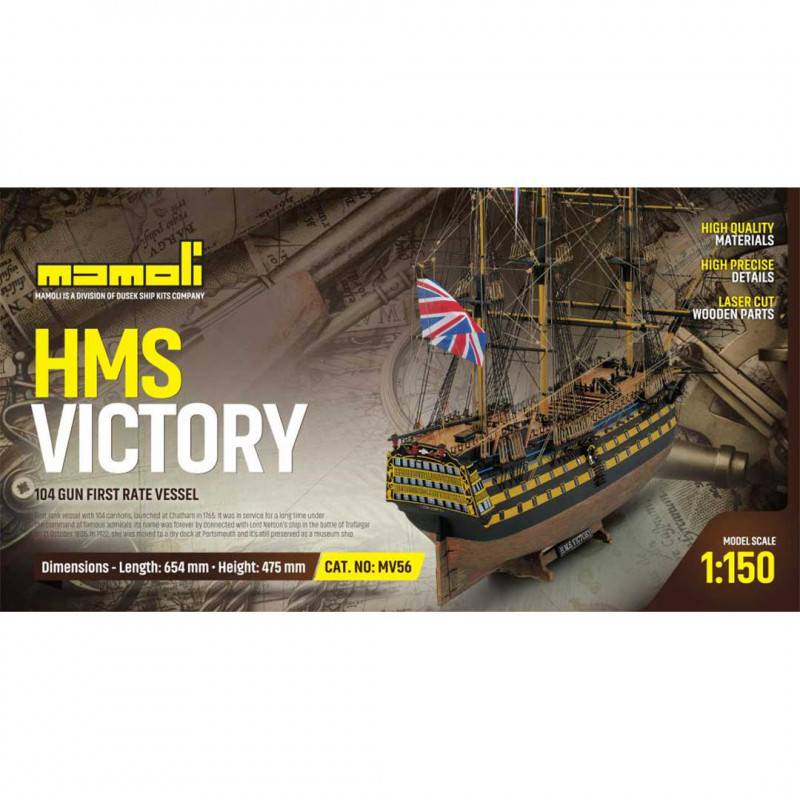 Die MAMOLI-Box mit der Referenz Z49MV56 ist ein exakter Nachbau des "King of the Seas" von Admiral Lord Nelson. Die Box enthält alle lasergeschnittenen Holzteile für eine perfekte Montage und Passung, der Bau erfolgt mit Spanten und Doppelbeplankung. Die Flaggen sind auf echter Seide gedruckt. Sehr detaillierte Beschläge, einschließlich Kanonen, Laternen, Galionsfigur usw.