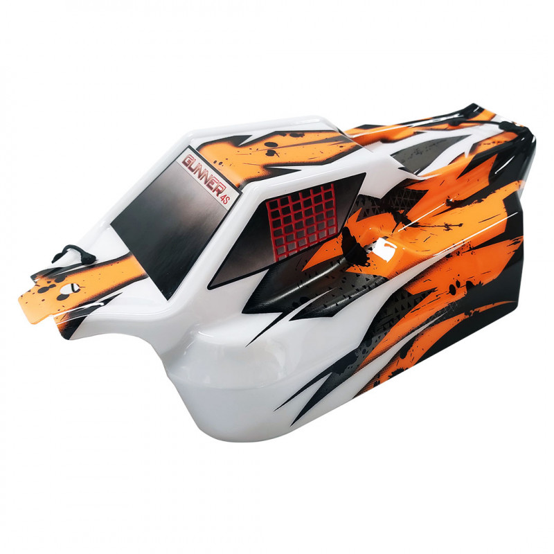 Orange / weiß / schwarz lackierte und ausgeschnittene Karosserie für Buggy Gunner 4S