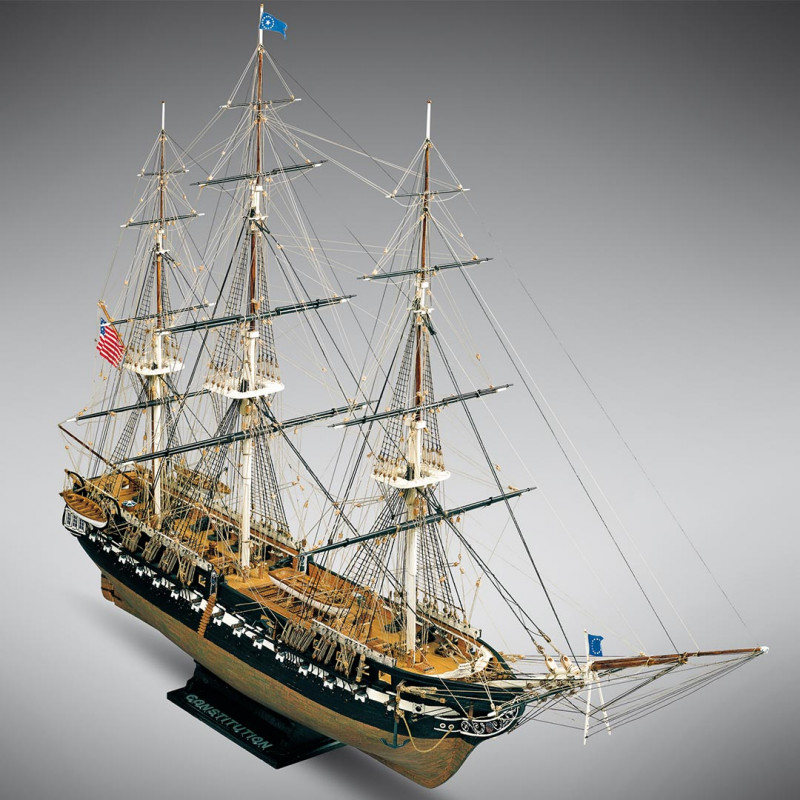 L'U.S.S. Constitution, frégate américaine de 54 canons, fut lancée le 21 octobre 1797. Elle avait des dimensions, une voilure et des armements supérieurs aux navires contemporains de sa classe. Sa construction robuste lui valut le surnom de « vieux flancs de fer », « Old Ironsides ». Elle fut protagoniste de plusieurs épisodes de batailles navales, dont le plus célèbre fut la victoire remportée sur la frégate anglaise « Guerrière » le 19 août 1812 pendant la guerre contre la Grande Bretagne. Par la suite elle fut transformée en navire-école et subit de nombreuses modifications. Actuellement, ancrée dans les chantiers de la Marine de Guerre à Boston, elle est destinée au musée naval. Dans la réalisation de ce modèle nous avons employé notre procédé habituel de sabords en métal qui permettent la parfaite exécution de ouvertures pour les canons sans besoin de percer le bordé et avons prévu le doublage avec plaquettes, comme dans l'original, qui donnent au modèle un aspect très réaliste.