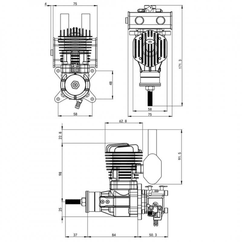 - Ein X-20cc-R Motor mit Heckauslass und Walbro Vergaser